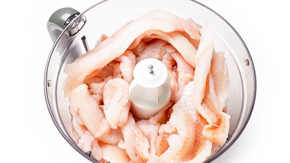 Филе минтая измельчить в блендере или пропустить через мясорубку. При загрузке в блендер учитывайте, что рыбу прокручивать сложнее, чем курицу, и закладывать ее нужно меньшими партиями.