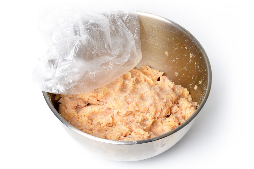 Накрыть пленкой и убрать в холодильник на 20-30 минут, чтобы фарш охладился и стабилизировался.