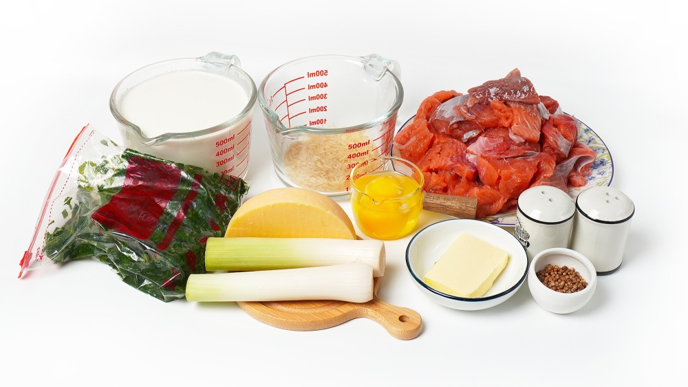 Подготовить ингредиенты: рыбу разморозить, взять рис, лук, шпинат, яйца, масло, специи.