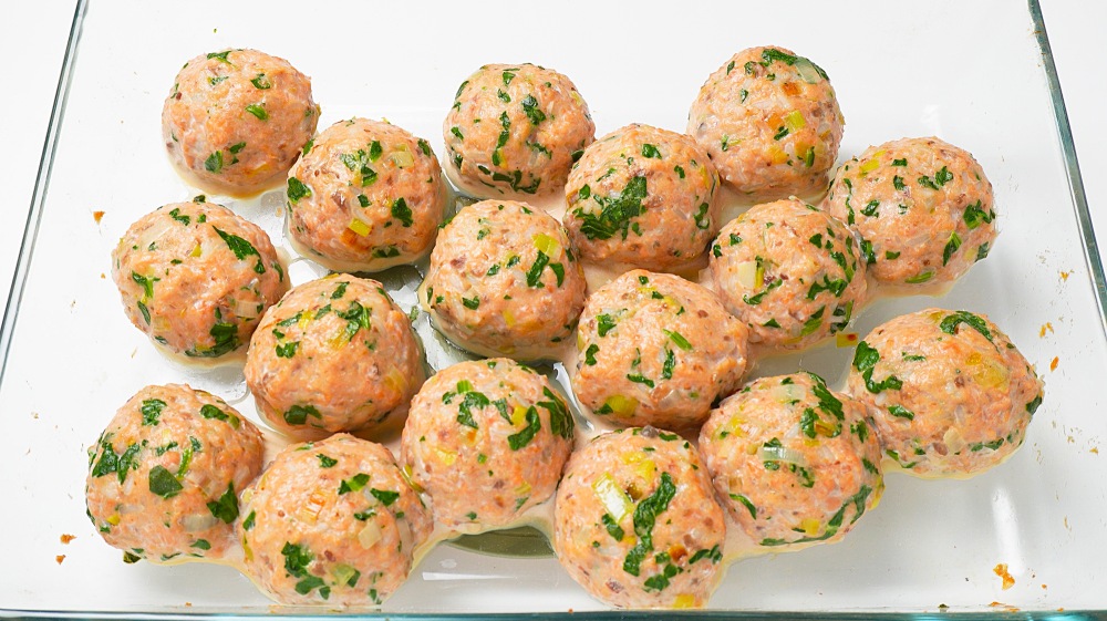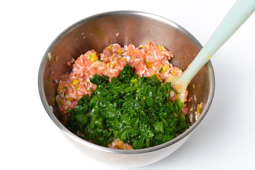 Шпинат делает тефтели еще более красивыми и аппетитными. Подойдет свежий или замороженный. Если брать свежий, то его потребуется в 2-3 раза больше. У бланшированного замороженного шпината вкус будет намного насыщеннее.