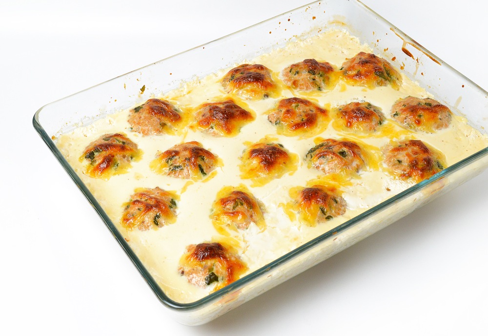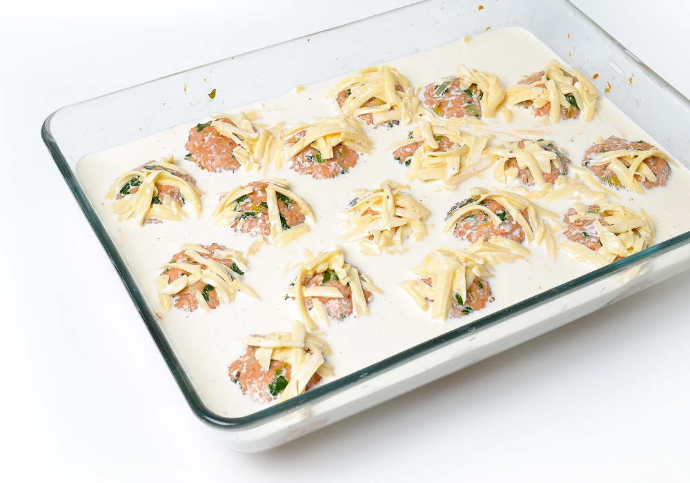 Залить соусом, распределяя сыр по «макушкам» тефтелей. Температуру уменьшить до 180-190 градусов и готовить еще 15-20 минут. Сливки должны хорошо прогреться, но не кипеть слишком интенсивно.