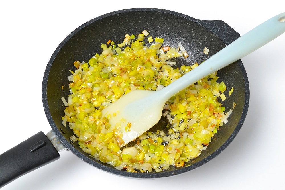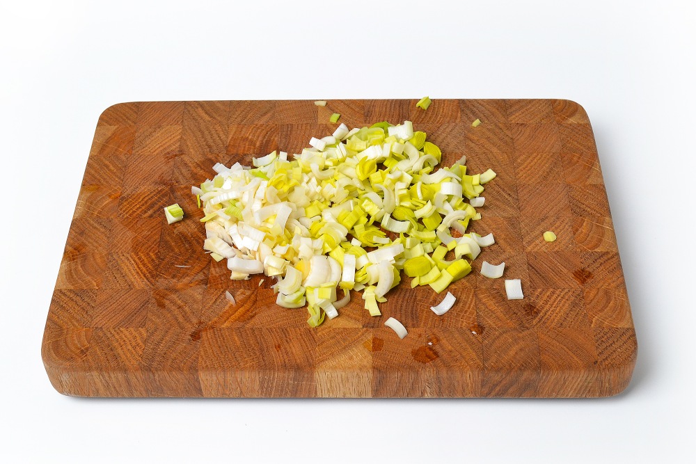 Лук-порей нарезать мелким кубиком. В сковороде разогреть растительное и сливочное масло.