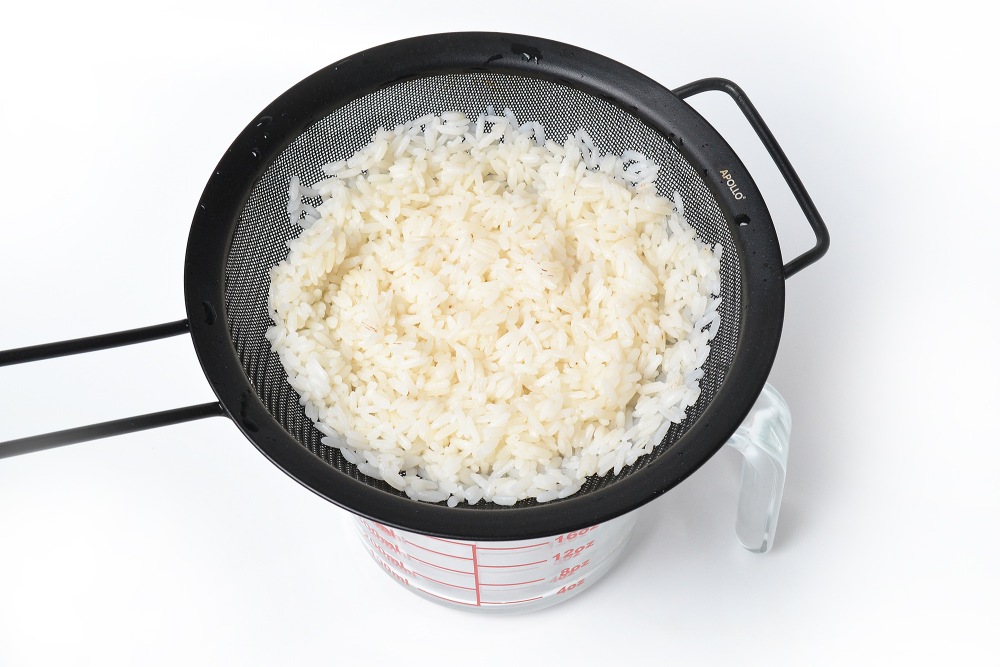 Рис отварить в кипящей воде 10 минут, а затем откинуть на дуршлаг и промыть прохладной водой.