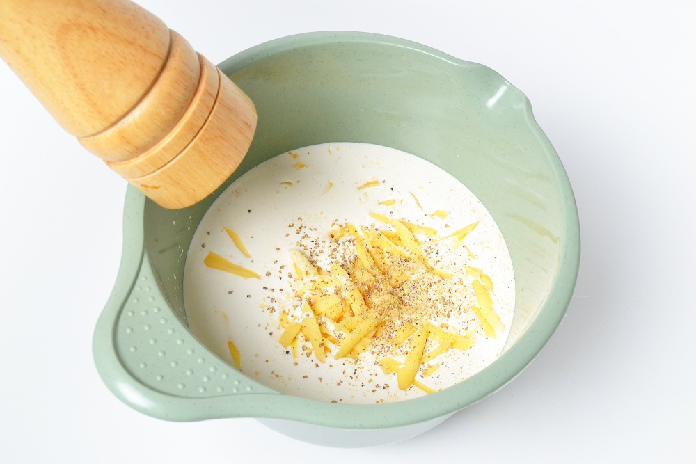 Подготовить соус: натереть сыр, добавить сливки, перец, соль.