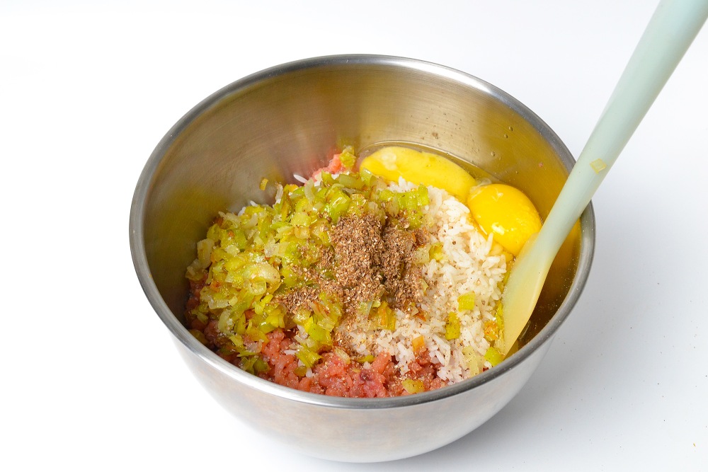 Туда же отправить молотый кориандр и 2 яйца, тщательно перемешать.