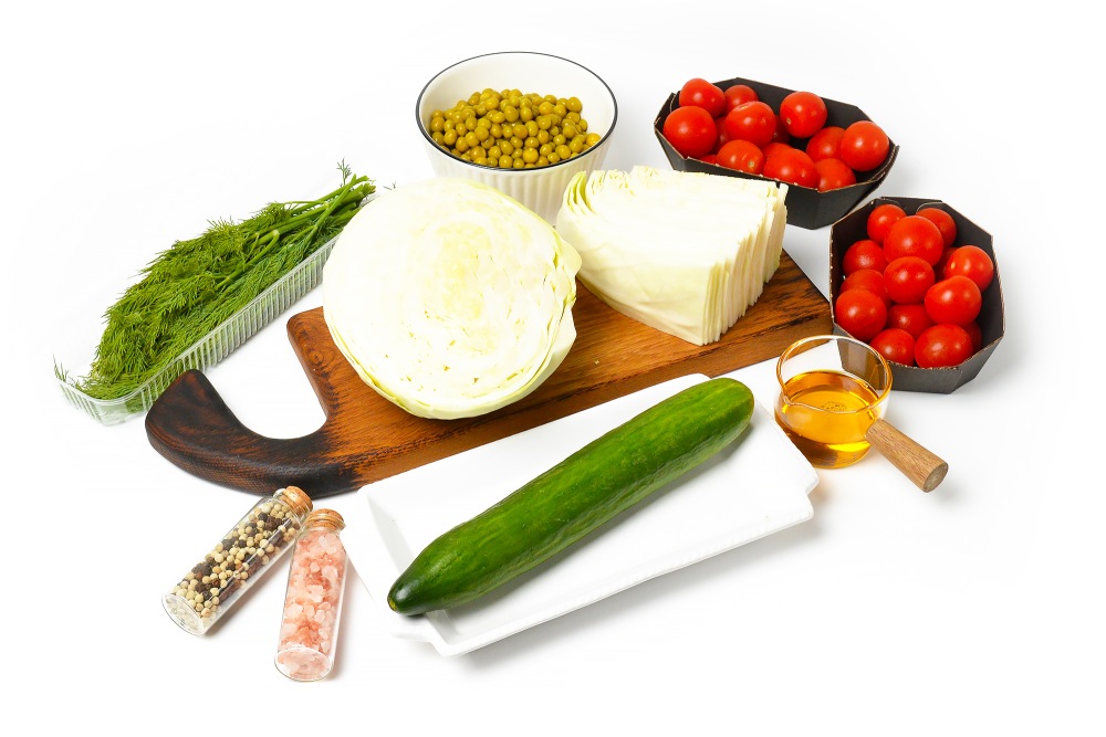 Подготовить ингредиенты для приготовления салата из капусты, огурцов и помидоров. Из указанного количества получается примерно 6-7 больших порций. В целом, вес ингредиентов здесь не строгий: можно взять больше огурцов или помидоров, как вам больше нравится. А горошек можно заменить консервированной кукурузой. Еще вместо консервированного горошка подойдет замороженный: отварите его около 5 минут, а затем обдайте холодной водой и остудите.