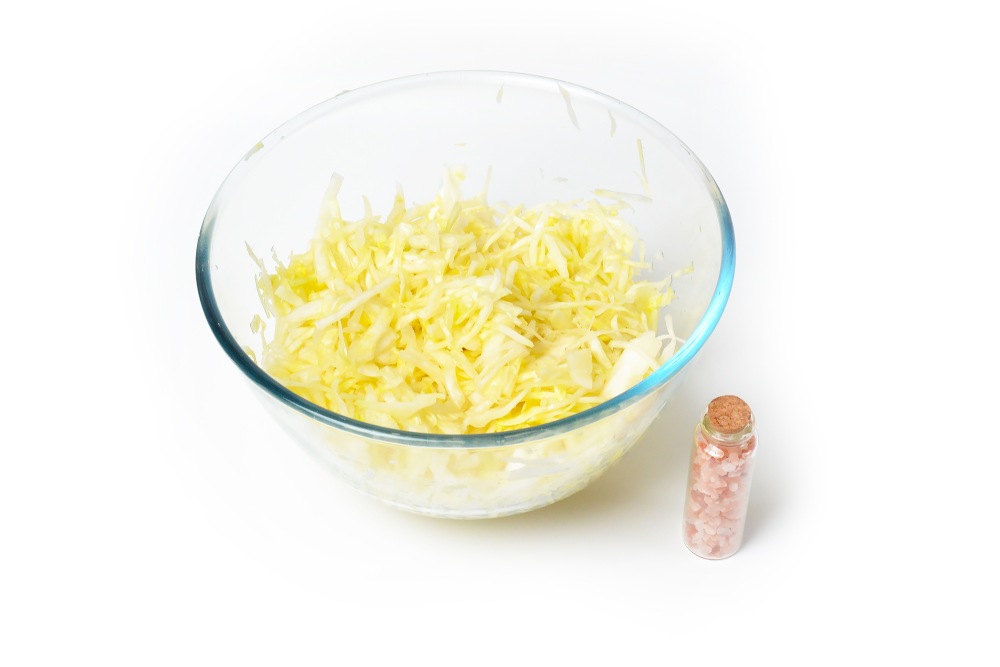 Положить капусту в глубокую миску или салатник и немного посолить, а затем сильно помять руками. Так капуста станет мягче, даст немного сока и уменьшится в объеме, что облегчит перемешивание.