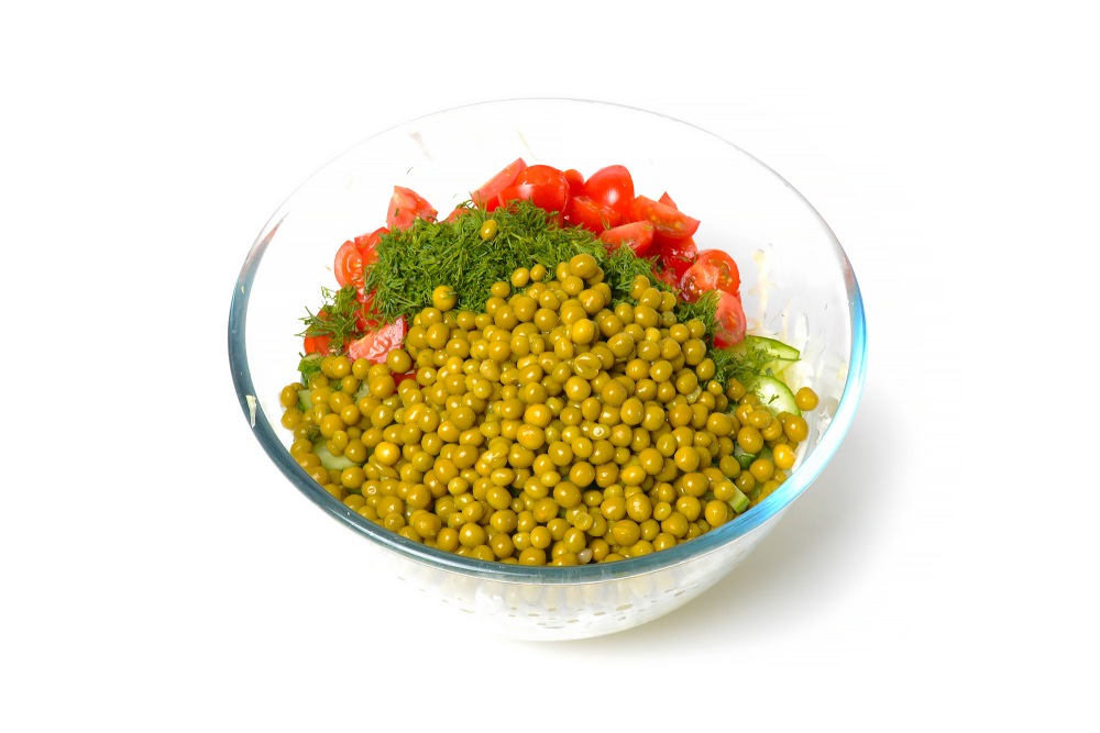 С горошка слить жидкость. Сделать это лучше заранее, минут за 15 до приготовления. Добавить его к салату. Туда же отправить измельченную зелень.