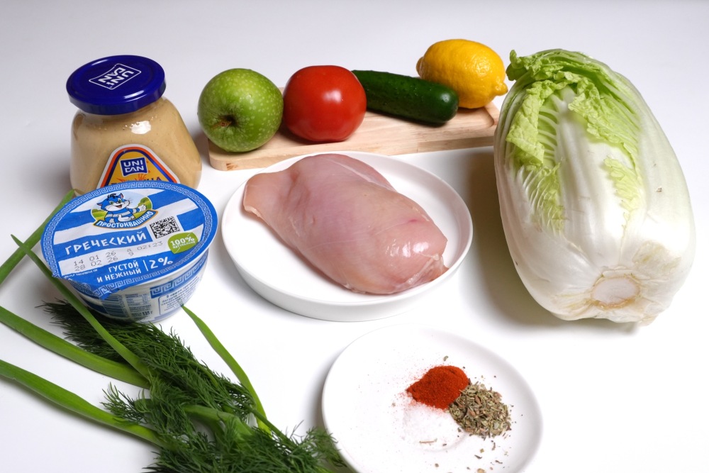 Подготовить все ингредиенты для приготовления салата из пекинской капусты с курицей и помидорами. Овощи и фрукты необходимо помыть, куриную грудку разморозить.
