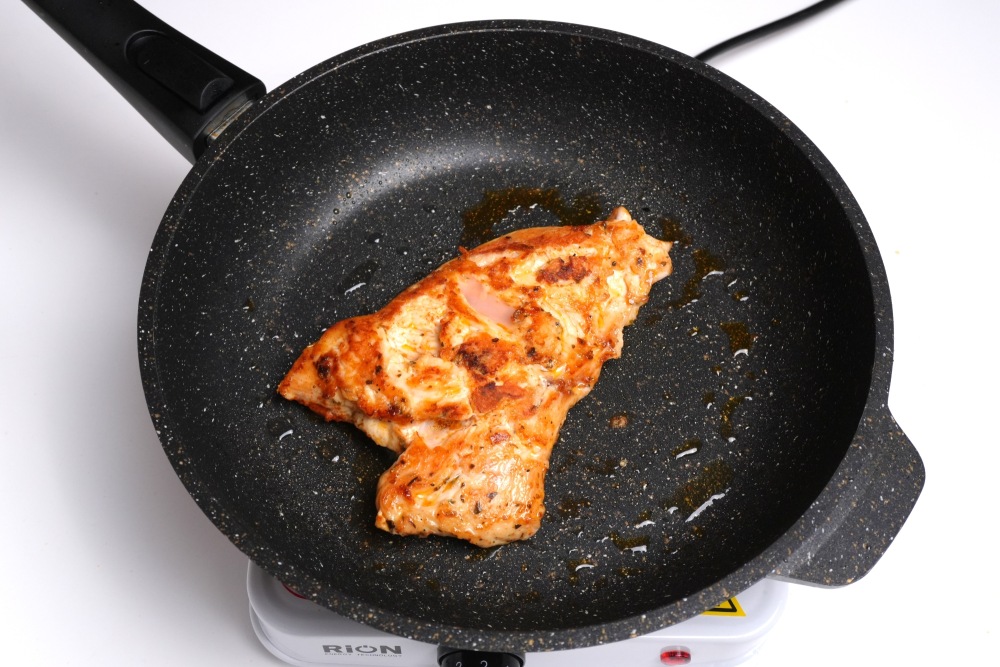 Маринованную куриную грудку обжарить на среднем огне с двух сторон до румяной корочки, примерно по 4-6 минут.