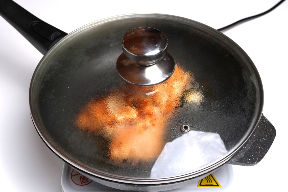 Огонь убавить, накрыть сковороду крышкой. Обжаривать грудку еще 10-15 минут. Проверить на готовность, сделав надрез.