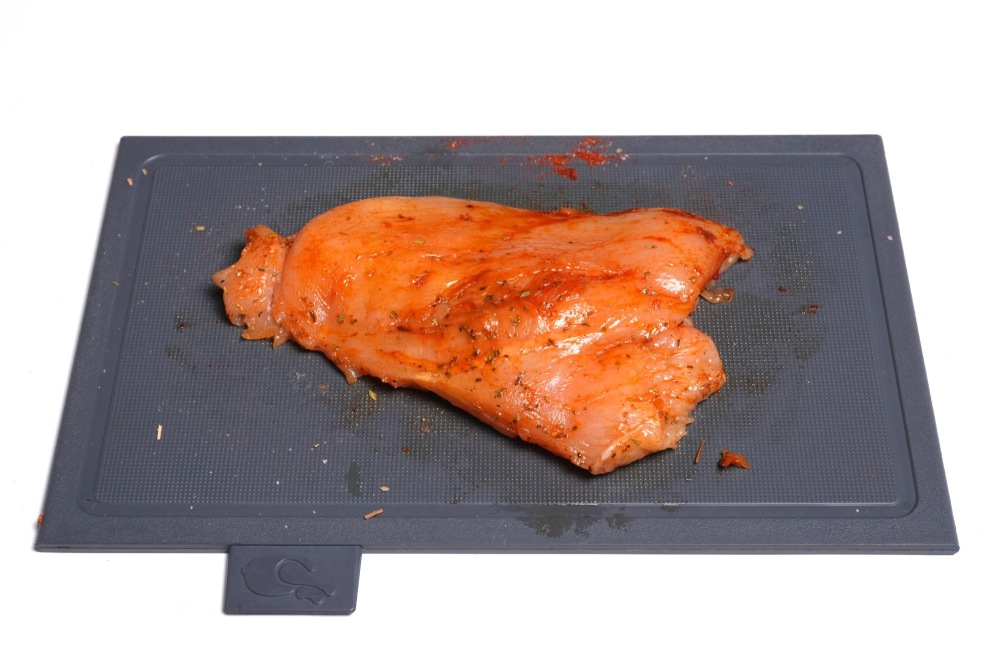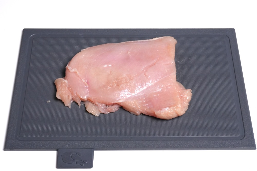 Первым делом займемся куриной грудкой. Чтобы она была сочной, ее нужно хорошо отбить и замариновать. Не рекомендую пропускать этап с отбиванием мяса, так как оно размягчает волокна и разрушает пучки соединительной ткани, что и способствует сочности и нежности готового мяса.