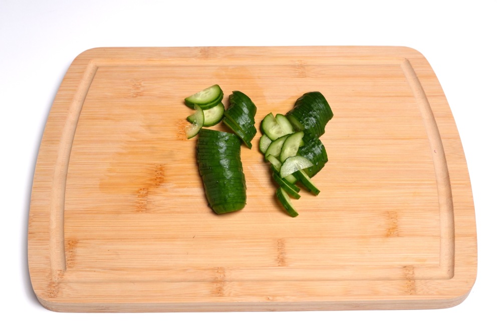 Огурец нарезать тонко. Если кожура толстая и горчит, ее лучше срезать.