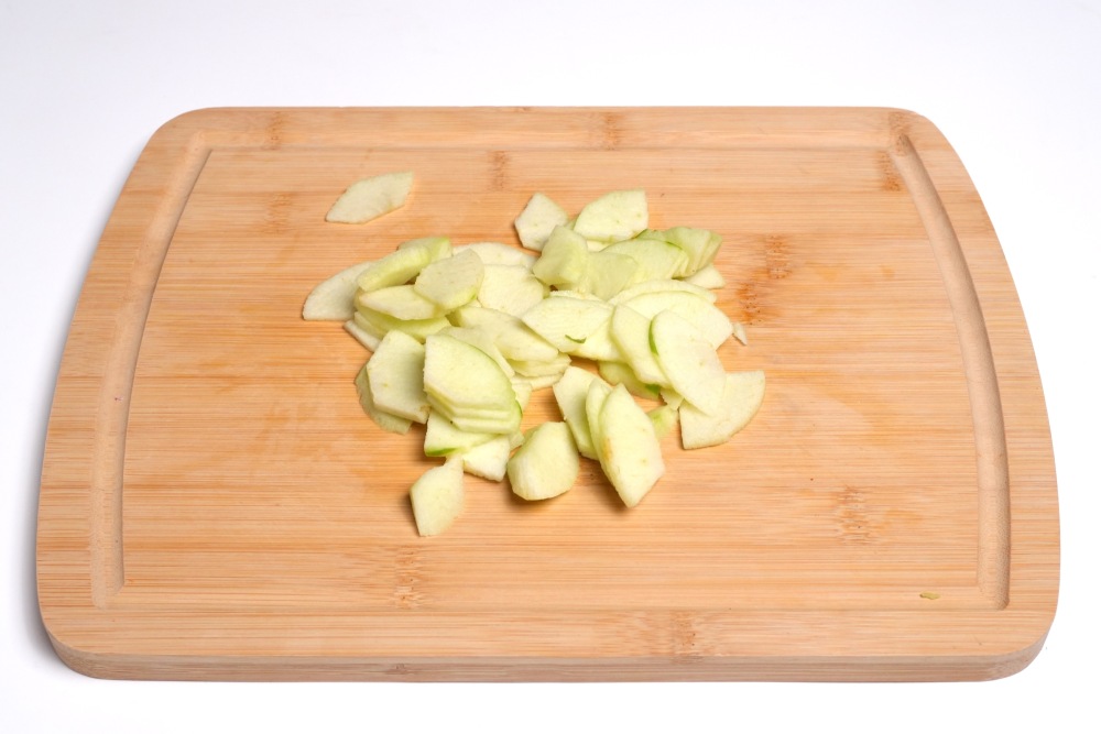 Яблоко очистить от кожуры, удалить семена и нарезать на четвертинки. Нарезать каждую четвертинку на тонкие слайсы. По желанию, можно сбрызнуть лимонным соком, чтобы яблоко не потемнело.