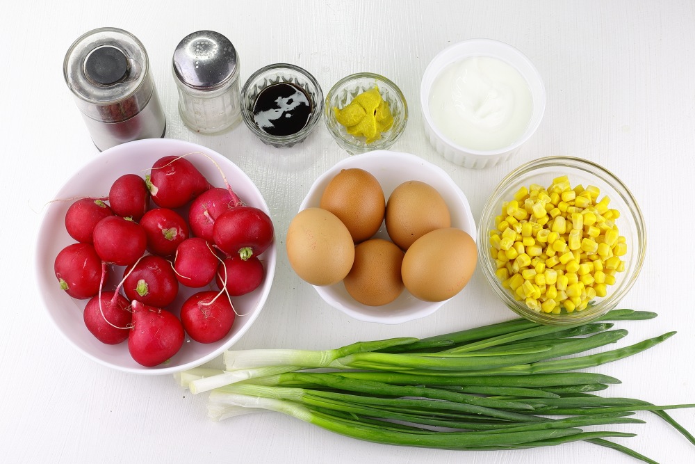 Подготовить необходимые ингредиенты для рецепта салата из редиски с яйцом и кукурузой.