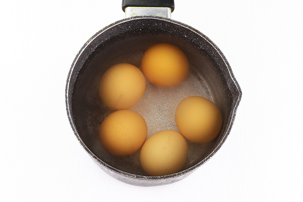 Яйца отварить в подсоленной воде 10 минут с момента закипания. Остудить в холодной воде.