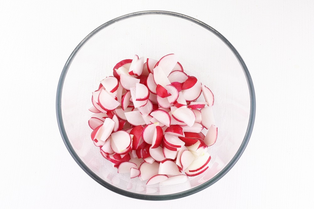 Редиску хорошо промыть в холодной воде. Обсушить бумажным полотенцем. Срезать хвостики с обеих сторон. Нарезать корнеплоды полукольцами. Пересыпать в глубокий салатник.