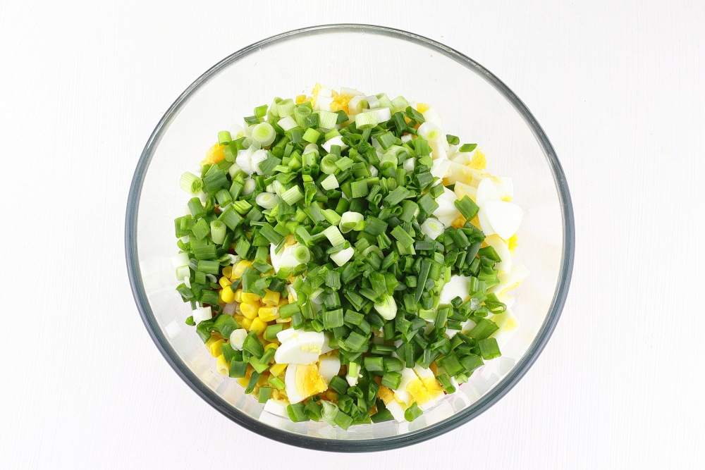 Хорошенько сполоснуть перья зеленого лука под проточной холодной водой. Обсушить бумажным полотенцем от лишней влаги. Нарезать средними кусочками, чтобы в салате чувствовалась сочная текстура стеблей. Всыпать нарезанную зелень к редису, яйцам и кукурузе.
