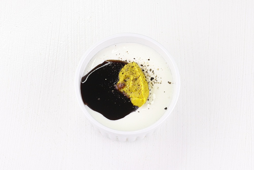 К сметане добавить горчицу, бальзамический соус, соль, перец. Перемешать.