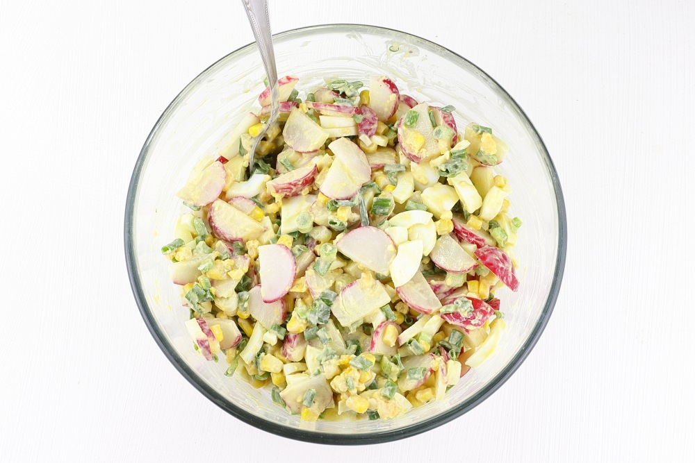 Салат из редиски с яйцом и кукурузой готов. Приятного аппетита!