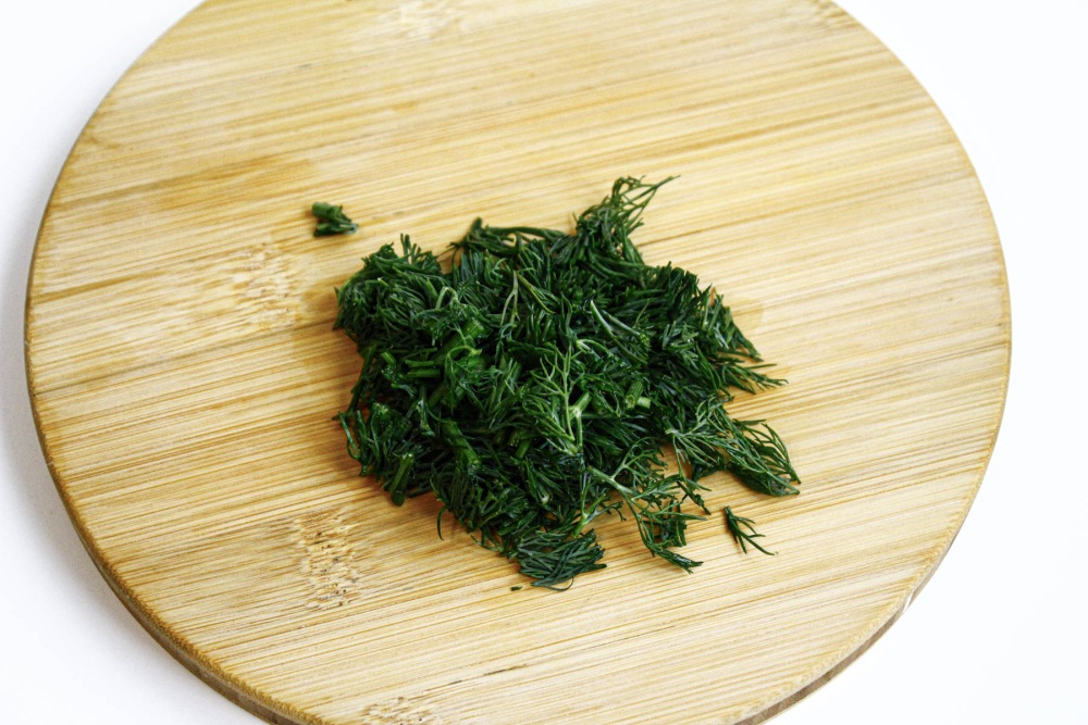 Взять укроп и промыть под проточной водой. Промокнуть бумажным полотенцем и мелко нарезать.