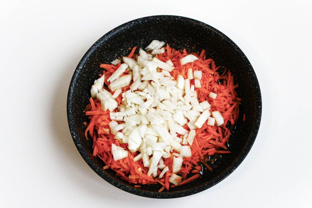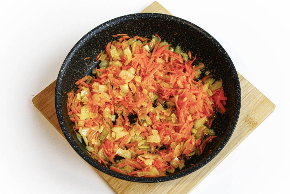 Обжарить лук и морковь на среднем огне/мощности в сковороде в течение 5 минут.