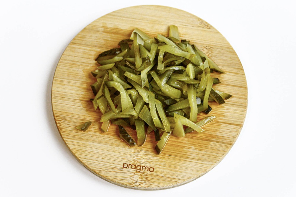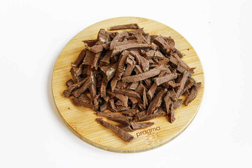 Отварное сердце остудить и удалить все жилки и пленки. Аккуратно нарезать соломкой.