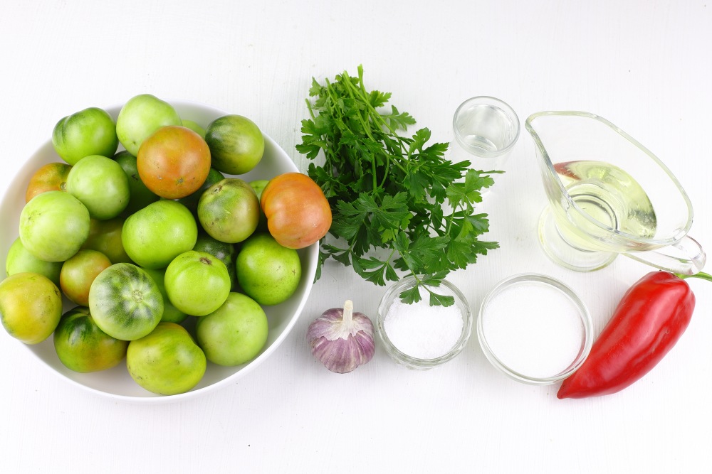 Подготовить необходимые ингредиенты для рецепта салата из зеленых помидор на зиму.