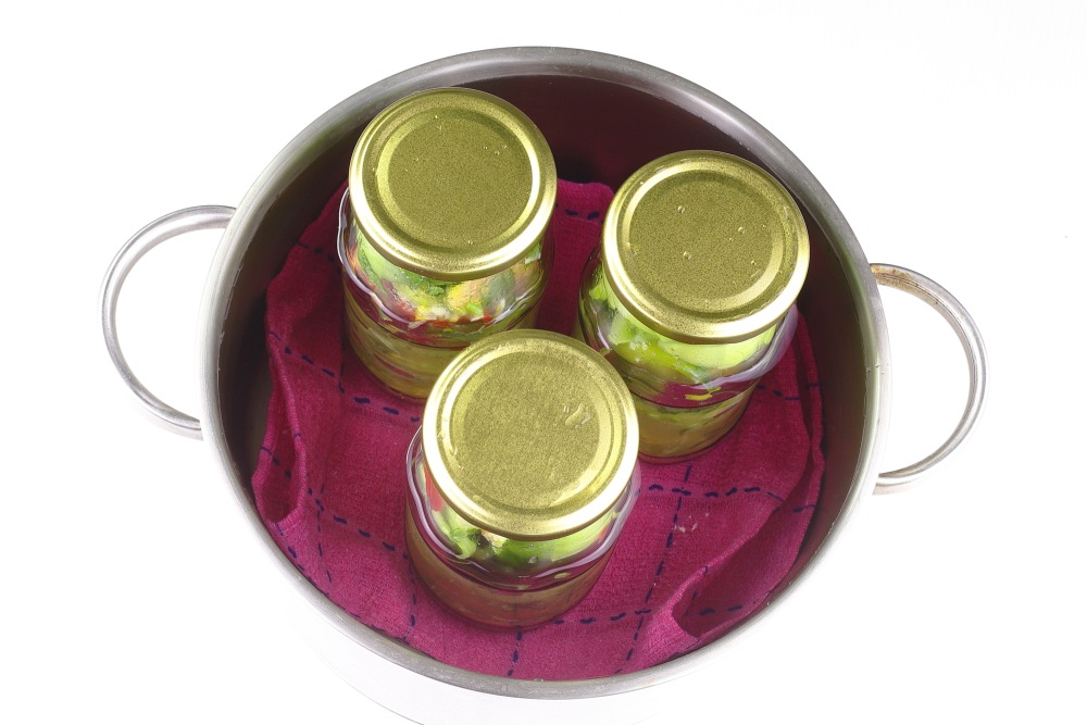 Наполненные банки прикрыть стерильными крышками. Стерилизовать 15 минут с момента закипания воды в кастрюле.