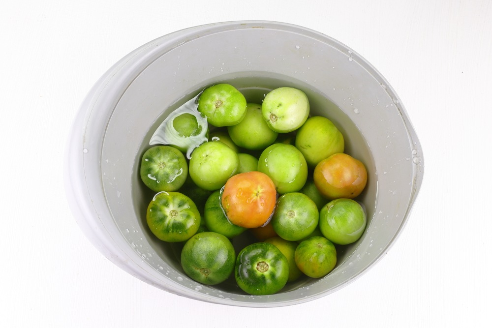 Зеленые помидоры перебрать. Наполнить большую миску холодной водой и аккуратно погрузить в неё помидоры. Оставить помидоры в воде на 5-10 минут.