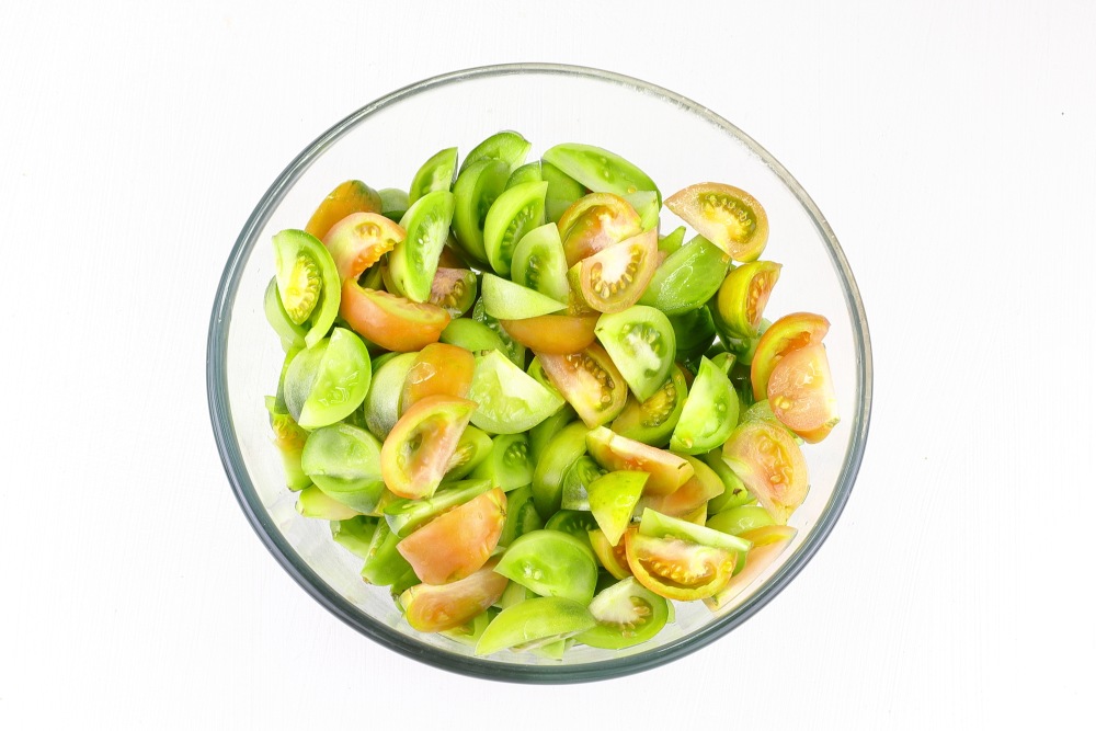 Промытые зеленые помидоры разрезать на 8 долек. Если помидоры небольшие, можно разрезать на четыре кусочка, а более крупные еще на больше долек. Переместить в глубокую посуду, которая будет достаточно вместительной для всех ингредиентов. Лучше всего использовать глубокую миску, кастрюлю или любую большую чашу из нержавеющей стали или эмалированную, стеклянную посуду.