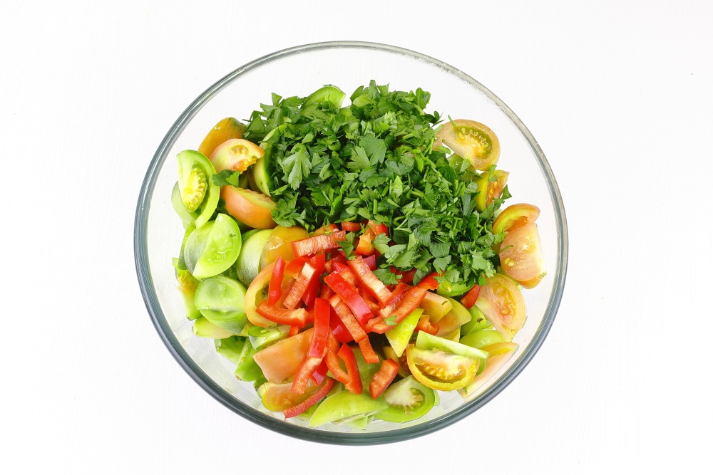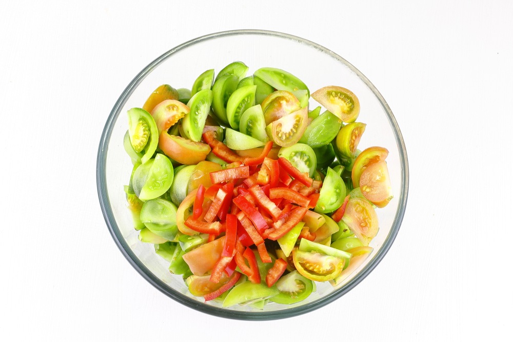 Избегать поврежденных плодов. Небольшие пятна можно убрать, но если помидор имеет явно поврежденную кожицу или начавший подгнивать участок, такой плод лучше оставить для других целей.Сладкий перец использовать любого цвета, желательно, мясистых сортов. Эти перцы идеально подходят для маринования, так как сохраняют свою форму и вкус даже при длительном хранении. Лучше всего выбрать плотный, без трещин и повреждений, спелый, но не перезревший перец. Он должен быть слегка хрустящим, что придаст салату текстуру.