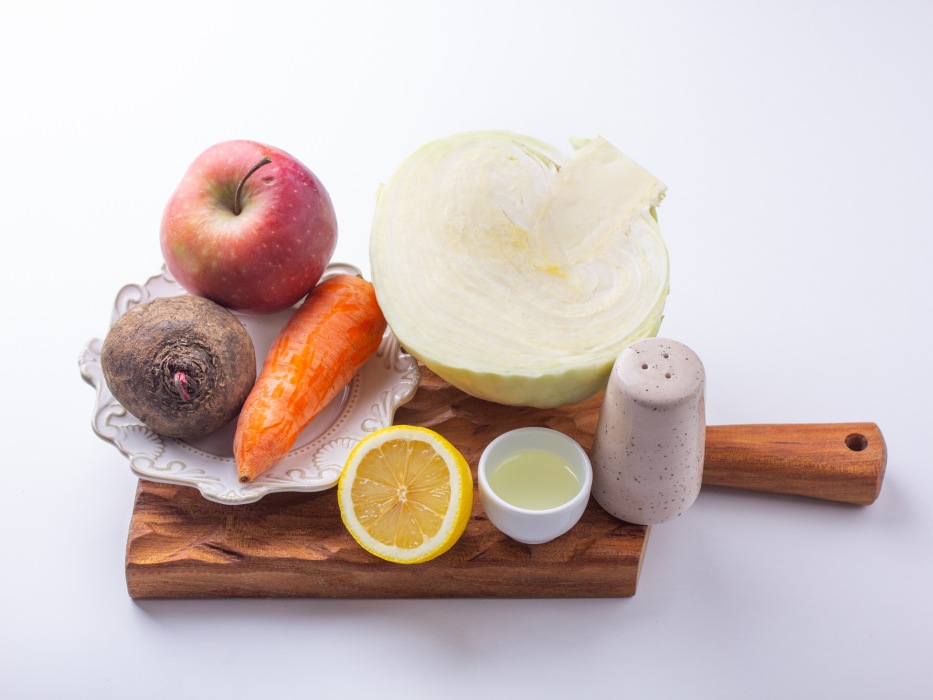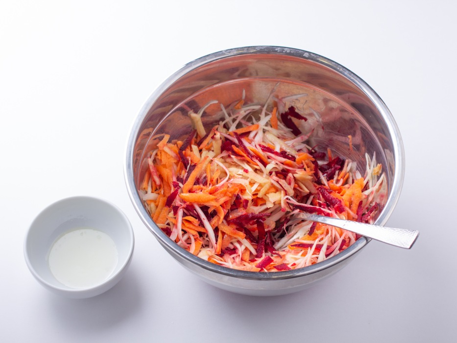 Добавить натертое яблоко в миску к остальным овощам. Кислота яблока поможет сохранить яркость цвета и добавит свежести. Перемешать все ингредиенты ложкой или руками в перчатках, чтобы овощи равномерно соединились.