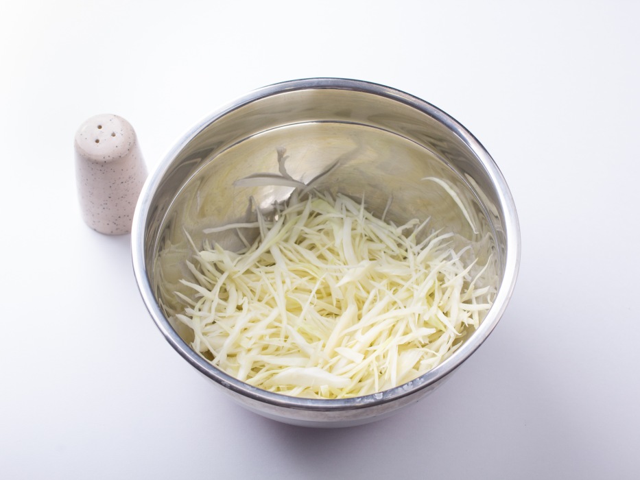 Положить капусту в миску, посолить и немного отжать, чтобы она стала более мягкой.