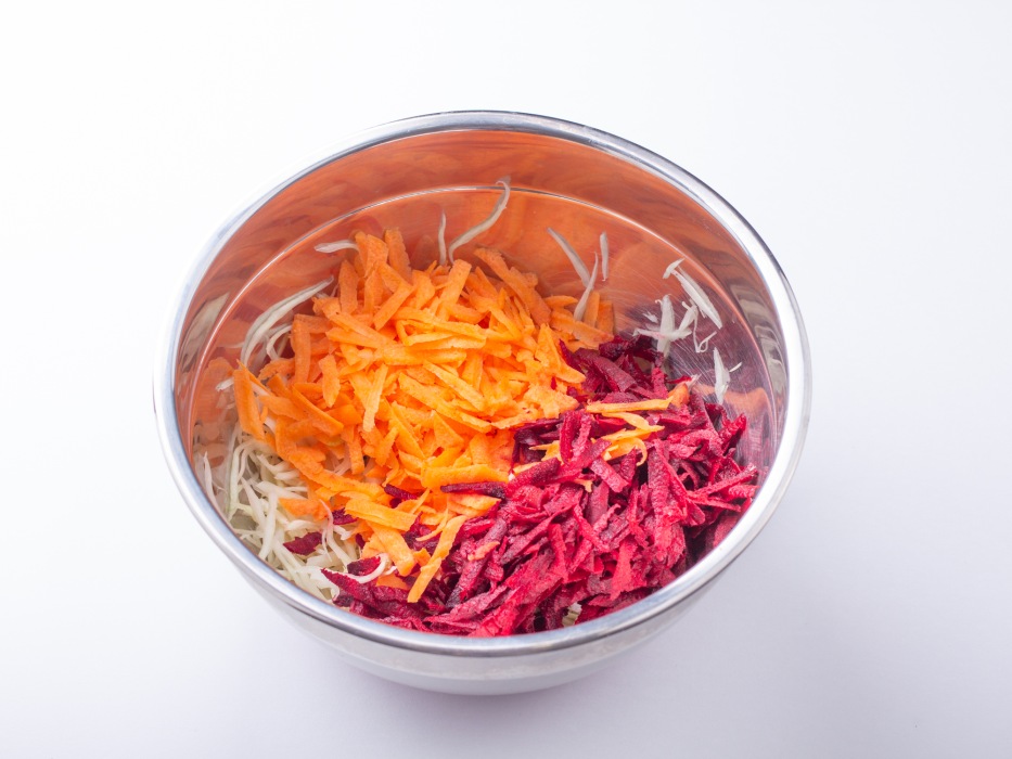 Добавить в миску к капусте подготовленную морковь и свеклу. Перемешать овощи, чтобы они равномерно распределились.