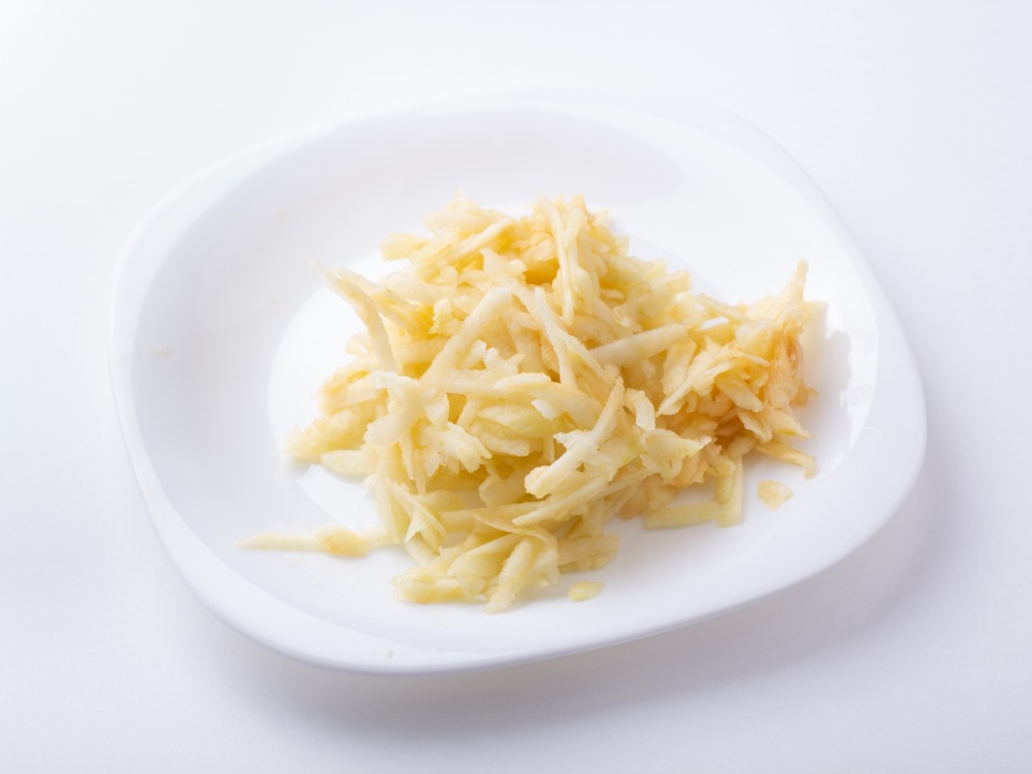 Яблоко очистить от кожуры. Удалить сердцевину с семечками. Натереть на крупной терке, стараясь делать это непосредственно перед добавлением, чтобы яблоко не потемнело.