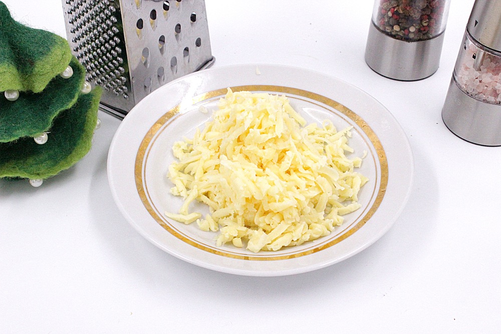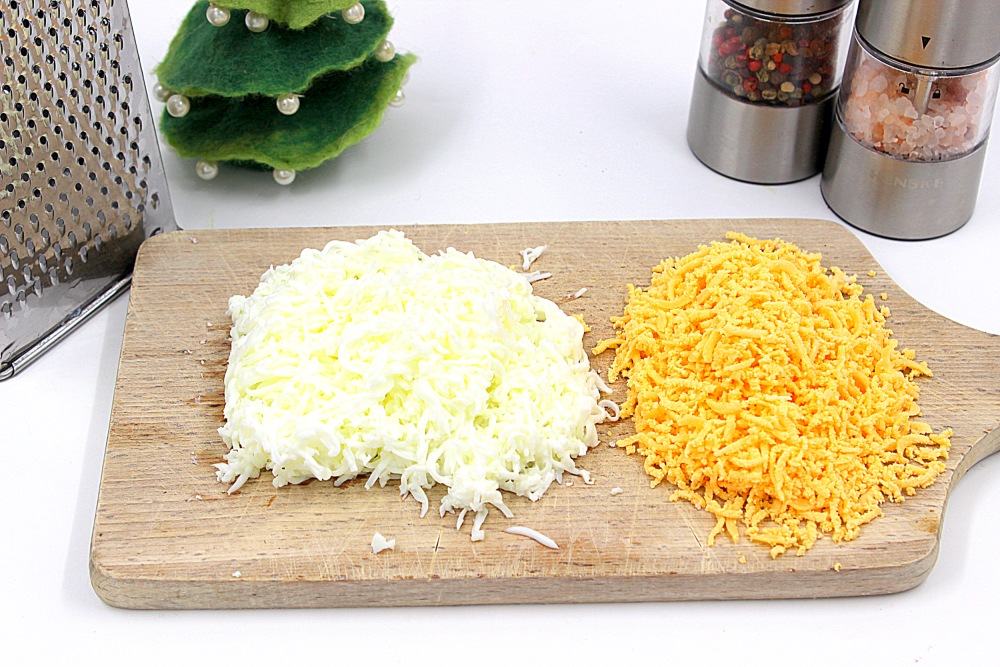 Подготовить ингредиенты для салата "Мимоза" с тунцом и сыром новогоднего.