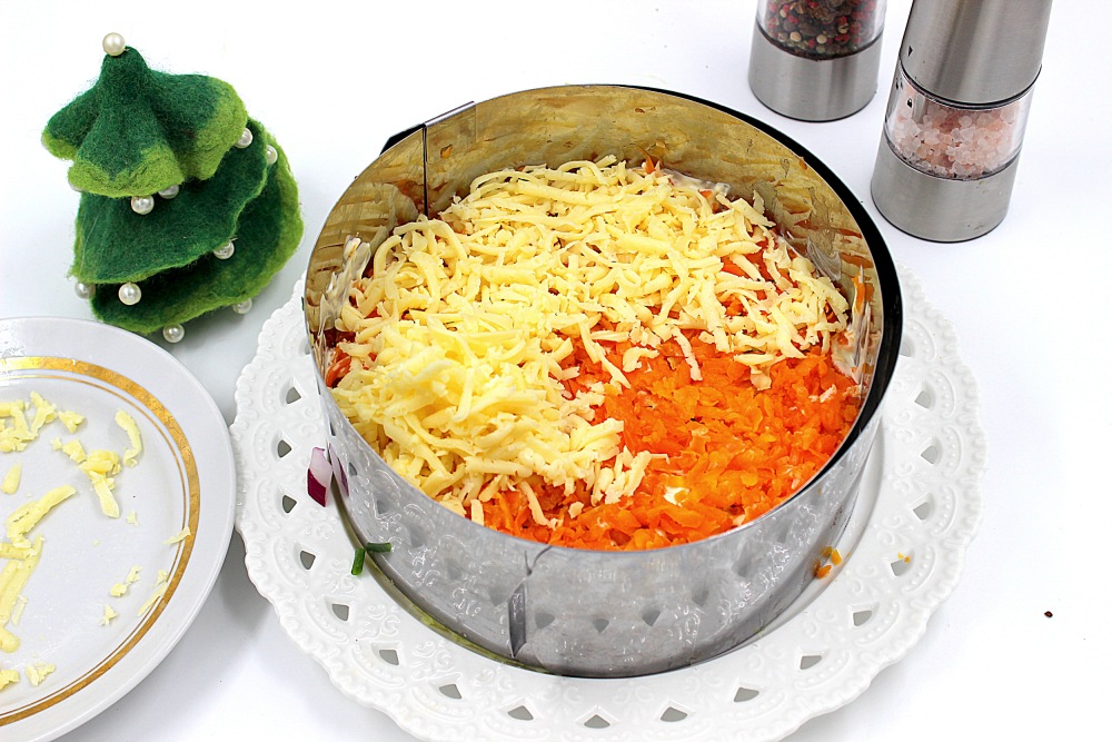Следующим слоем натереть и распределить морковь, а поверх сыр.