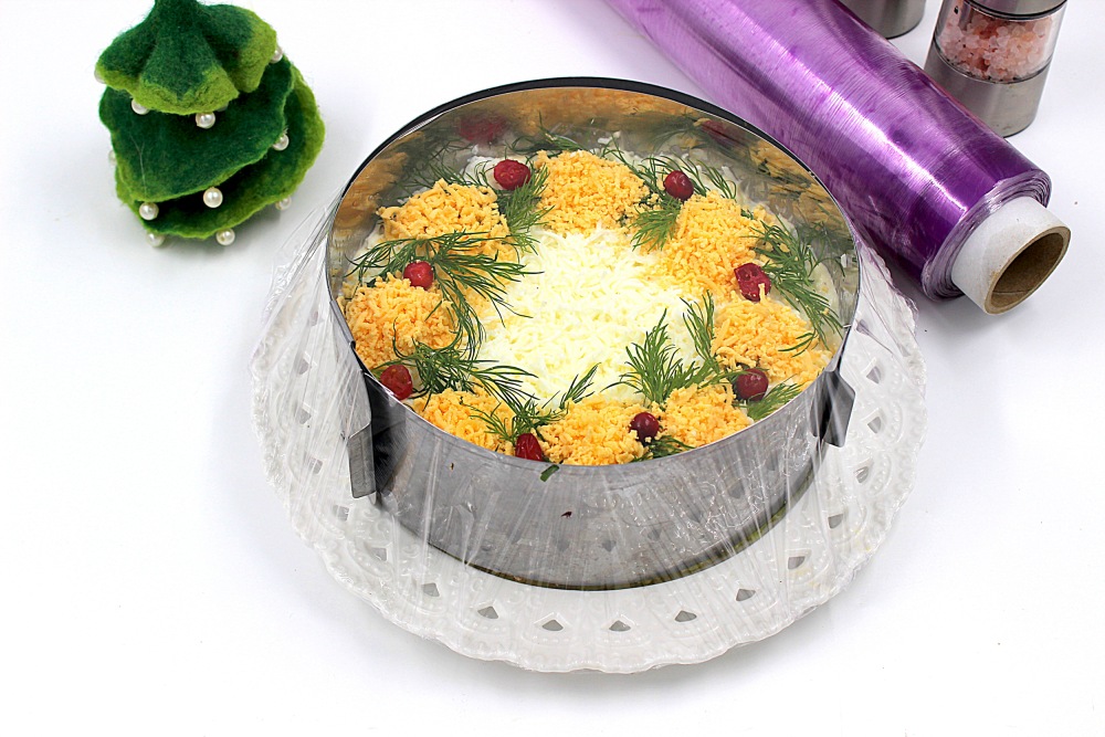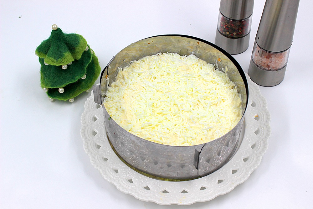 -Многие считают что салат ни в коем случае не надо утрамбовывать. Если вы делаете его в прозрачной, глубокой тарелке, то да, точно не надо. А вот если вы формируете его в сервировочном кольце, то слегка утрамбовать очень даже желательно, что бы мимоза сохранила свою форму.