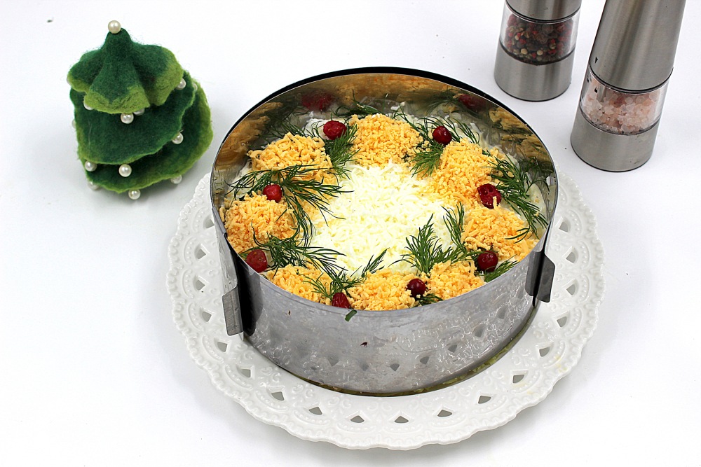 Новогодний салат "Мимоза" с тунцом и сыром готов.