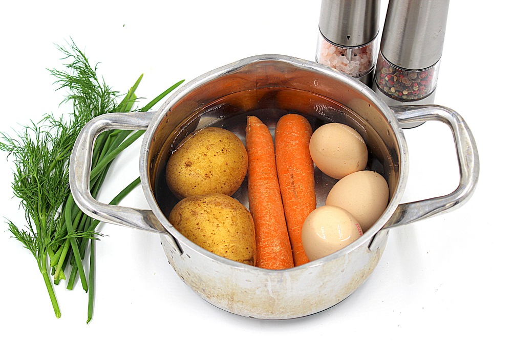 Всегда варю всё вместе. Ставлю таймер на 10 минут и через это время выбираю яйца, а всё остальное варится дальше. Время зависит от размеров. У меня средние картофелины и не толстая морковь. Это примерно 25 минут варки.