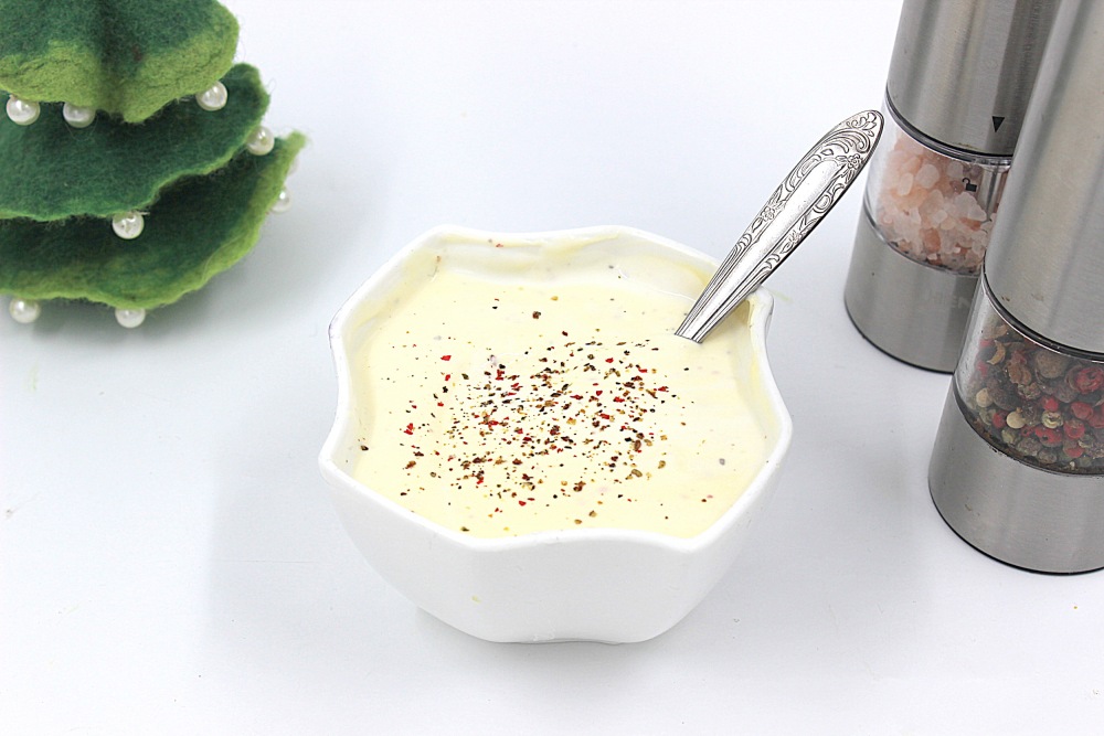 Для соуса смешать майонез, йогурт, щепотку смеси перцев и щепотку соли.