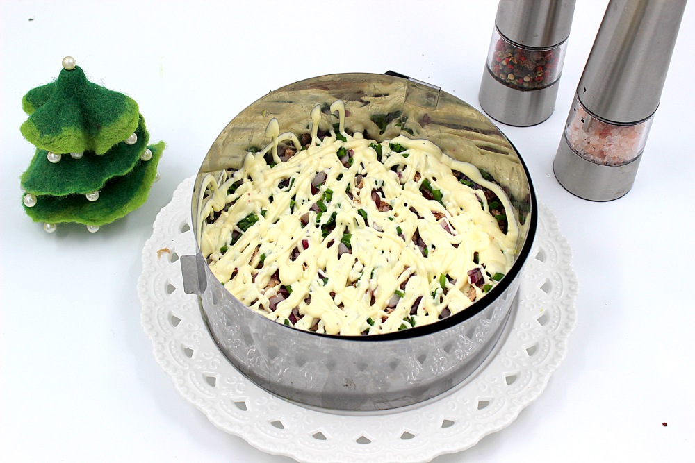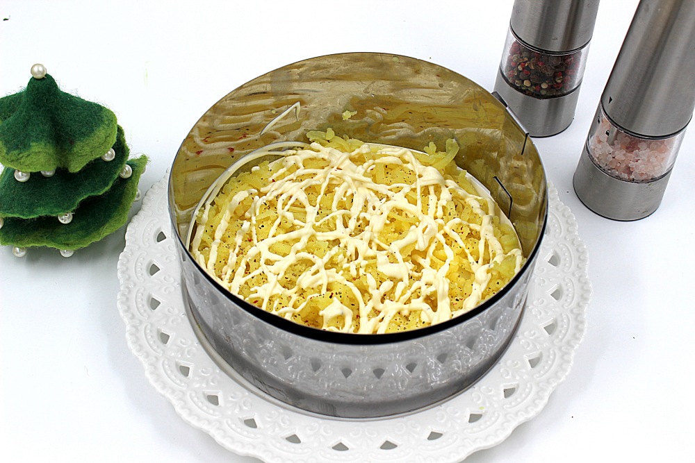 На тарелку поставить кольцо и прямо сюда натереть картофель. Разровнять, немного посолить, поперчить и смазать тонким слоем майонезной заливки.