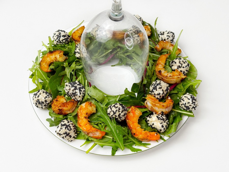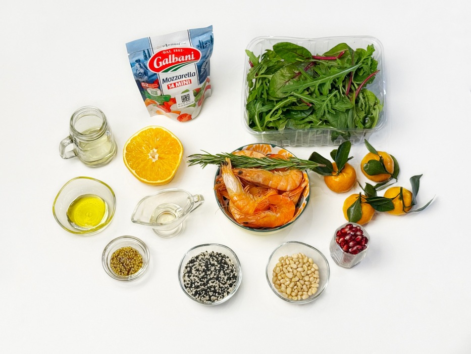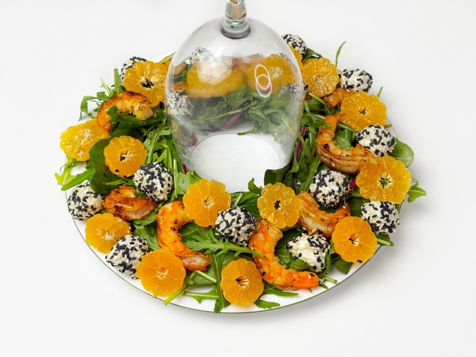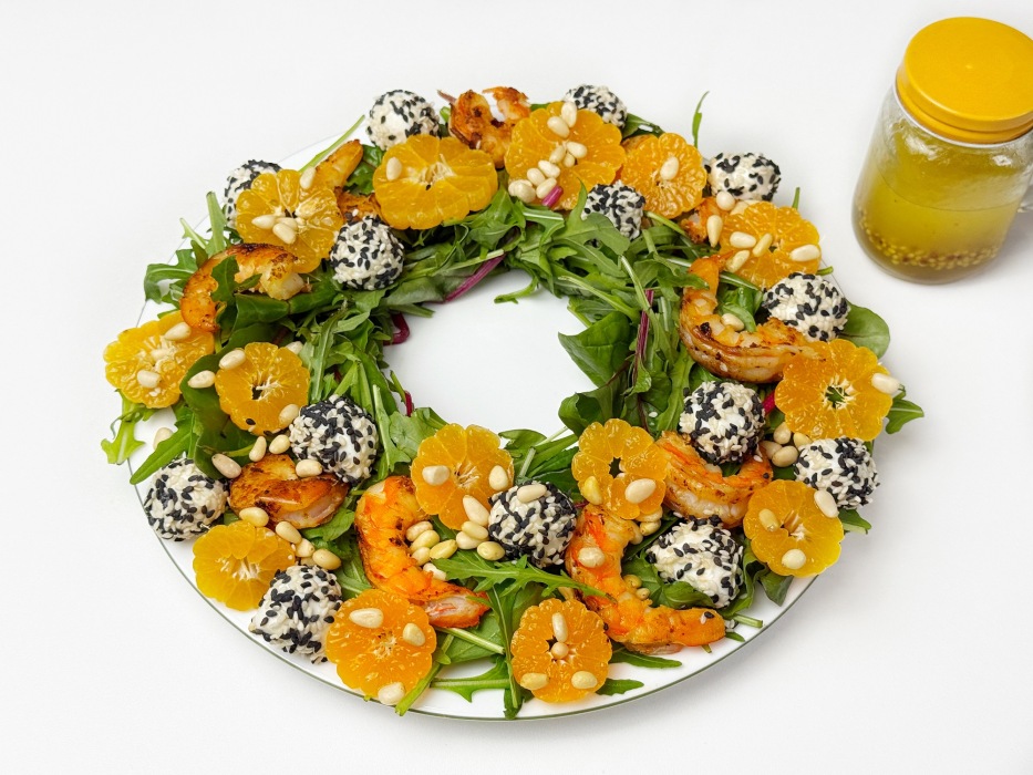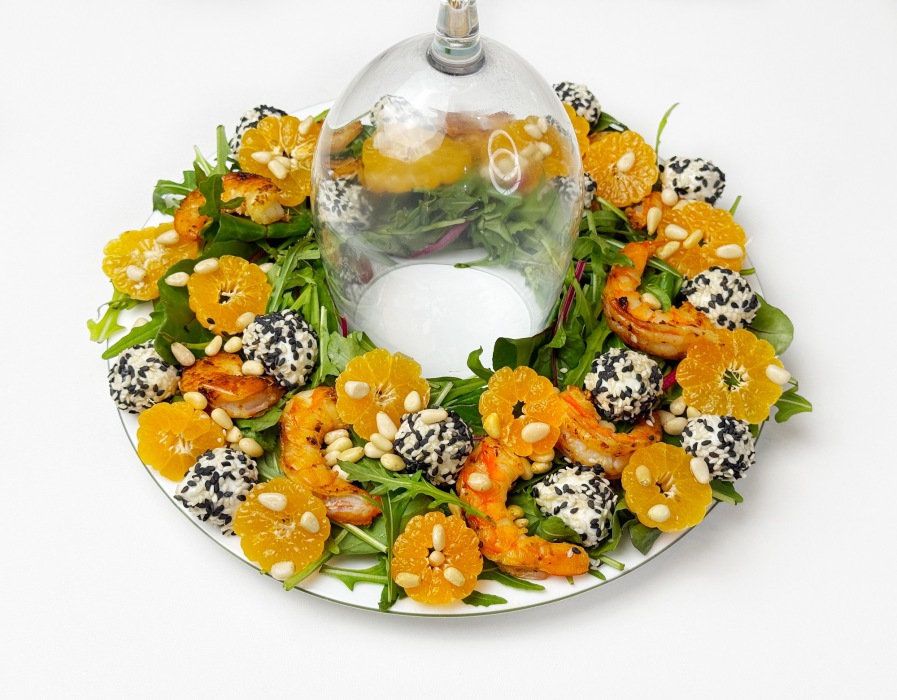 Он не утяжеляет стол, наоборот освежает, радует глаз и поднимает настроение уже с первого взгляда. Хруст зелени, сочные мандарины, тёплые обжаренные креветки, нежная моцарелла в кунжуте и ароматная заправка с апельсиновым соком создают идеальное рождественское сочетание.