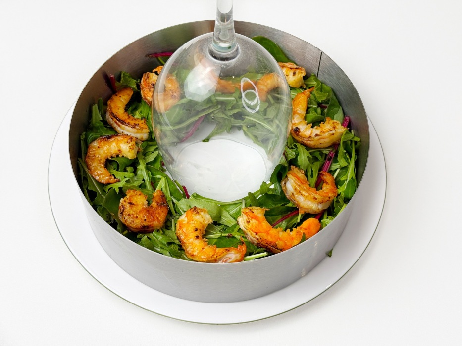 Следующим слоем поверх зелени по кругу выложить обжаренные креветки.