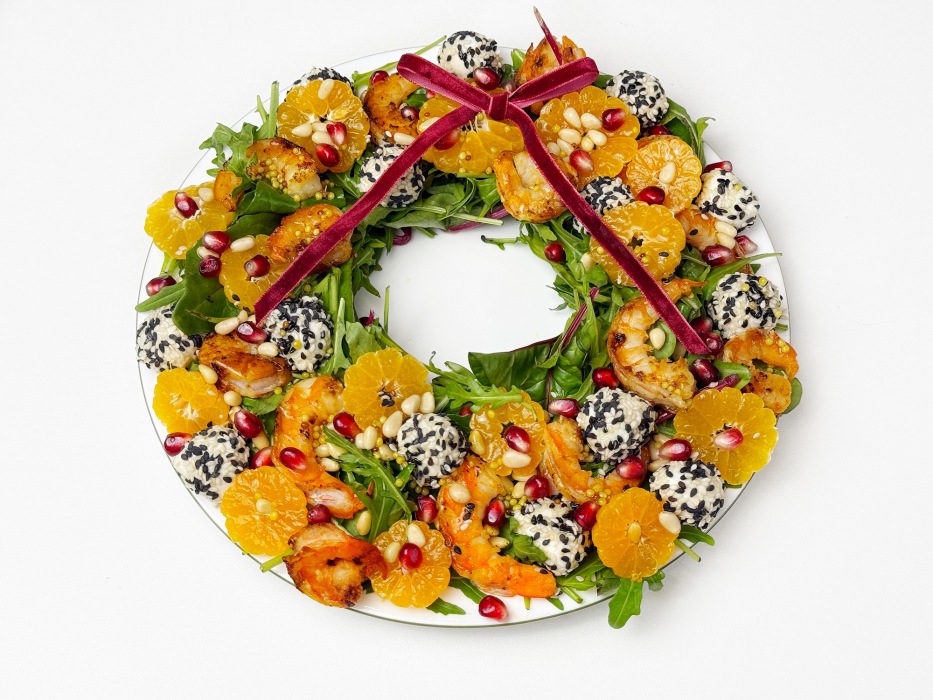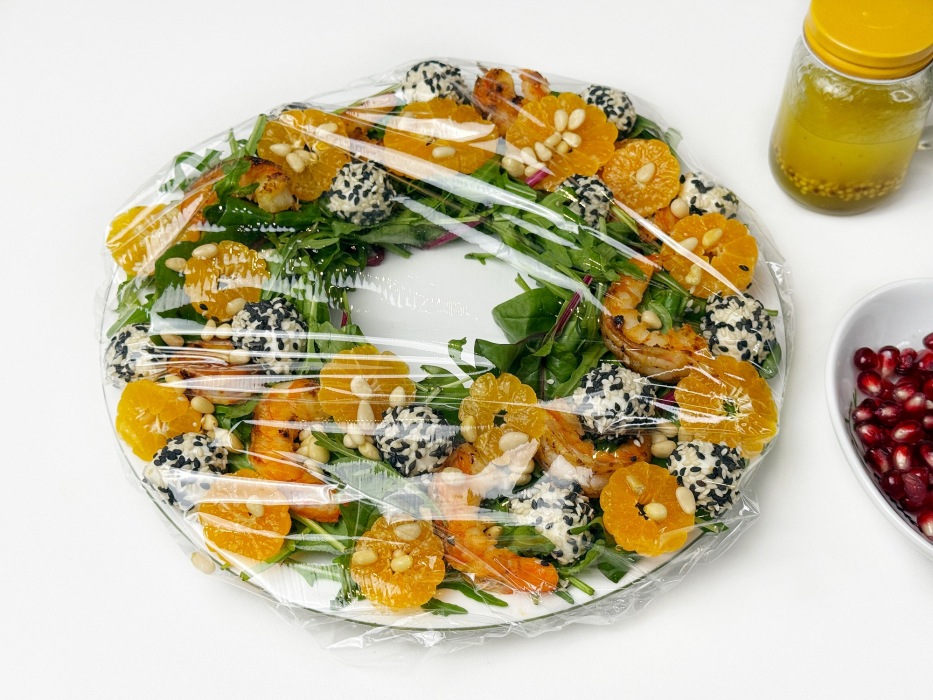 Подать салат на праздничный стол и наслаждаться, каждый кусочек сочетает свежесть зелени, сладость цитрусов, нежность моцареллы и ароматные креветки, а праздничные акценты — гранат и кедровые орешки делают его настоящей звездой стола. Пусть этот «Рождественский венок» дарит радость, создает настроение праздника и съедается в первую очередь!