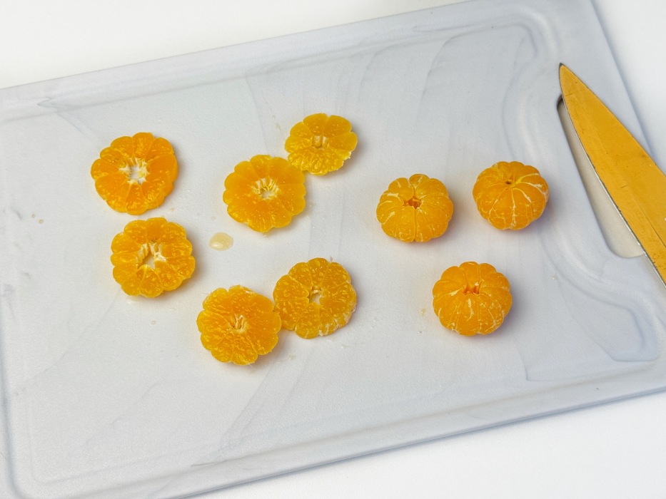 Мандарины очистить и нарезать тонкими кружочками.