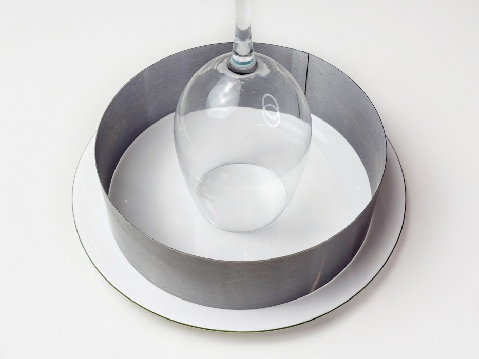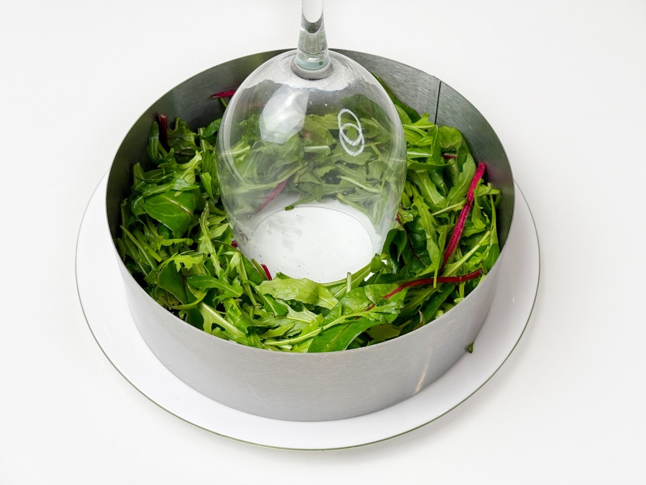 Собирать салат удобно в кулинарном кольце, используя бокал или стакан для формирования центра. Если кольца нет под рукой, просто разложите зелень вокруг бокала, придавая форму веночка.