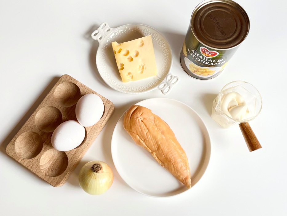 Я использовала в салате копчено-вареную куриную грудку. С ней получается сочно и нежно, рекомендую. Ананас консервированный не советую заменять на свежий, так как сироп тут дает сочность и сладость, что не всегда есть в свежих ананасах. Сыр понадобится полутвердый, например, гауда, масдам или российский. Главное, чтобы у него был сливочный или нейтральный вкус, и он хорошо терся.