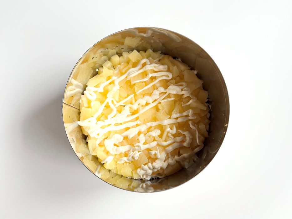 Выложить нарезанные ананасы. Покрыть тонким слоем майонеза.